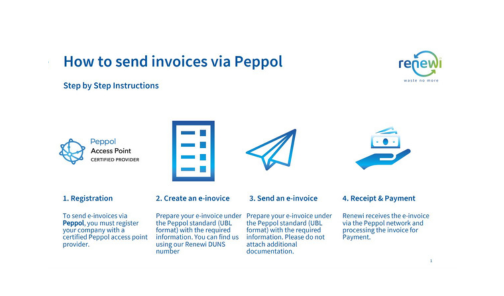Peppol Facturatie verwijst naar het veilige uitwisselen van gestandaardiseerde elektronische facturen (e-facturen) via het PEPPOL-netwerk (Pan-European Public Procurement On-Line). Deze methode vereenvoudigt het facturatieproces en zorgt voor interoperabiliteit tussen leveranciers en landen binnen de Europese Unie. Peppol wordt vanaf 1 januari 2026 verplicht voor Belgische bedrijven.Voor andere landen is het de voorkeursmethode van Renewi om facturen te ontvangen. Dit kan in 4 eenvoudige stappen worden uitgevoerd: